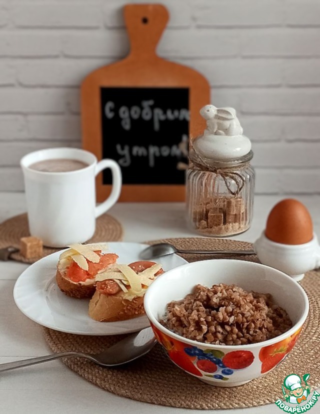 Обязательно 1 яйцо всмятку или обжаренное на сковороде специальной без масла с вязким желтком. Сегодня у меня яйцо всмятку. Пара маленьких бутербродов на кусочках багета, промазанных тонким слоем сливочного масла, с красной малосолёной рыбой (у меня горбуша) и присыпанных стружкой Пармезана. Какао на половину с молоком. Сахар я на чашку какао кладу 1 кусочек тростникового коричневого или вовсе не кладу. Пользуюсь какао-порошком, растворимый не признаю. Какао полезно: антиоксидантный эффект, улучшение кровообращения, стимуляция работы мозга, снижение уровня сахара.......