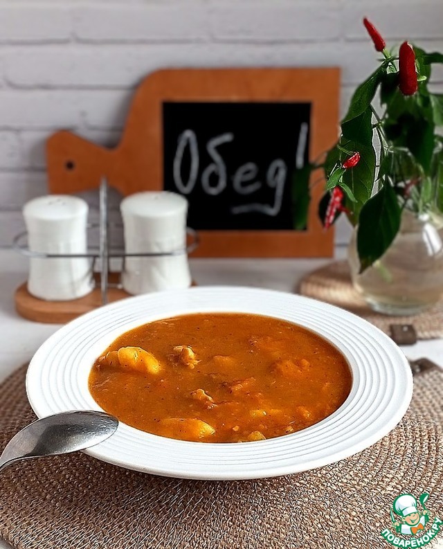 На обед я потушила тыкву с овощами: кабачок, морковь, картофель и репчатый лук, добавила немного перца-кайен и куркумы. Тушила с мясом курицы, порезанного кусочками. У меня получилось такое первое-второе.