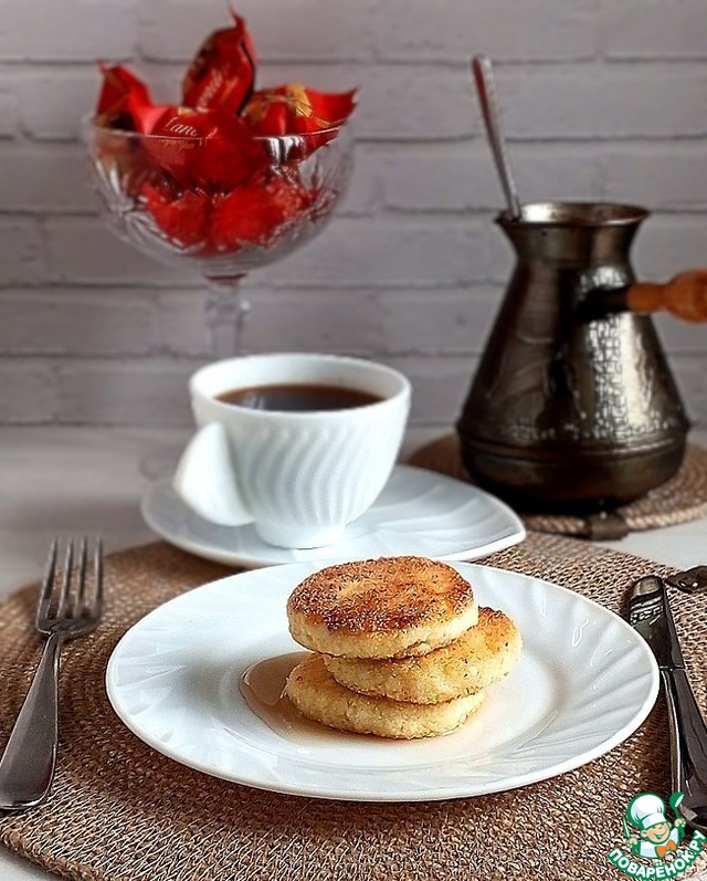 На полдник я сделала сырники без яйца с манной крупой и ванильным сахаром. Полила их кленовым сиропом, так как сахара в массу сырную положила очень мало. Сырники жарю на сливочном масле.
