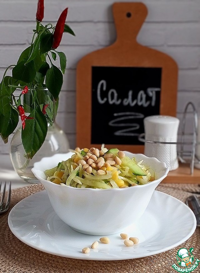 Ну, а так как у меня день был довольно насыщен едой, то на ужин у меня был салат. Лёгкий и полезный. Салат из белокочанной капусты + консервированная кукуруза + огурец, заправленный лимонным соком и оливковым нерафинированным маслом, присыпала я его немного 1 ст л кедровыми орешками.