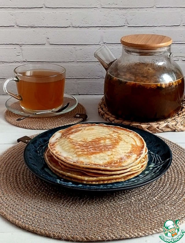 К блинчикам заварила Иван-чай с облепихой и гвоздикой. Блинчики ела со сгущёнкой. Конечно 5 шт я не съела. Съела 3 шт. Они в диаметре-15 см, толстые. Овсяное толокно очень полезно!!!