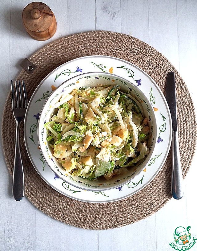 На обед я запекла голени куриные в сметане с луком и чесноком. Гарнир не делала к ним. Я приготовила салат. Салат из пекинской капусты+огурец+яйца+Пармезан. Заправила майонезом немного.