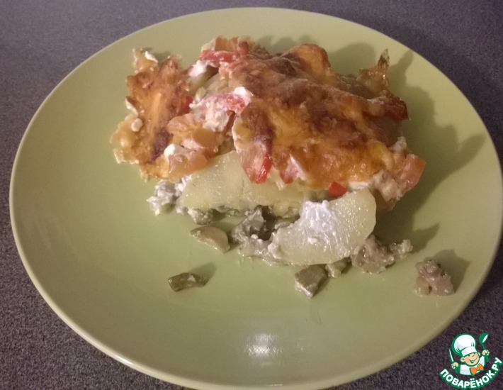 Слить соус из мяса. И укладываем все в форму для запекания смазанную растительным маслом слоями: 1 - мясо, 2 - грибы с луком, смазать немного майонезом, 3 - картофель, 4 - помидоры, 5 - перец болгарский, смазать майонезом и посыпать сверху сыром.