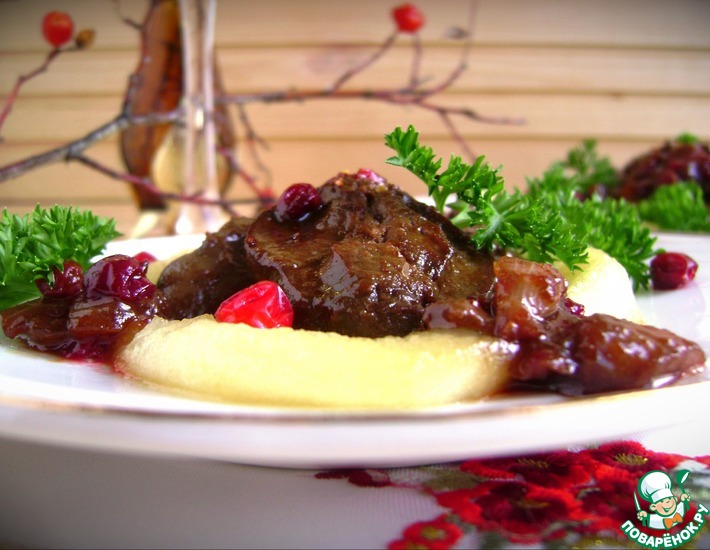 Выложить печень к яблокам, полить соусом с луком и брусникой, присыпать чуть перцем чили и подавать к бокалу белого вина. Хорошо подать к печени свежие белые тосты.