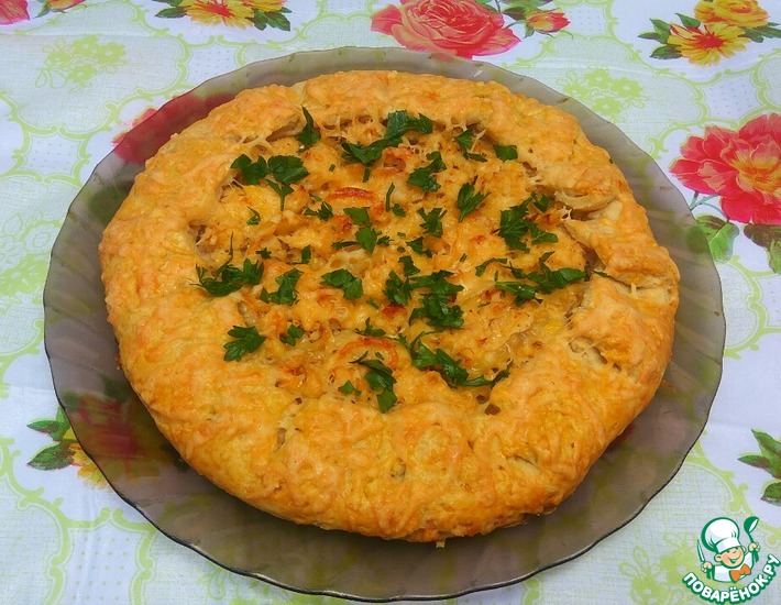 Собрать тесто по краям, формируя складочки. Центр с начинкой оставить открытым.