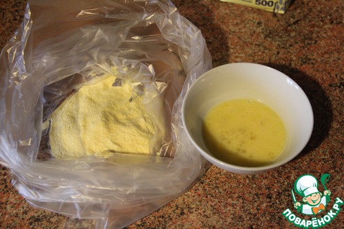 Каждый кусочек обмакиваем в яйцо и перекладываем в пакет с мукой.