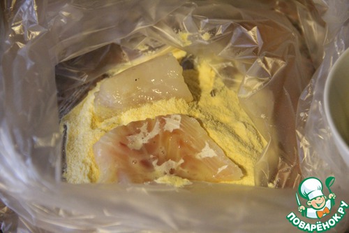 Когда все кусочки оказались в пакете, берем его в руки и встряхиваем, чтобы вся рыбка хорошо обвалялась в муке.
