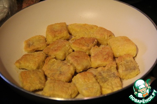 Итог - имеем отлично запанированные кусочки рыбы, чистый стол и руки, а также отсутствие грязной тарелки. Ну еще и время экономится.