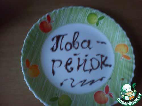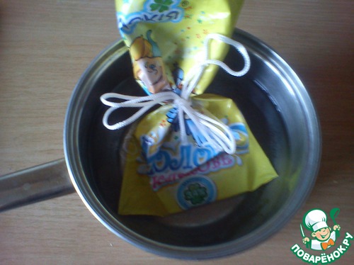 Подогрейте немного воды в кастрюльке (не кипятите), Положите шоколад в плотный пакет (я использывала пакет с под молока) и перевяжите его - это для того, что бы убрать лишний воздух и опустите в кастрюлю с водой. Через 1 мин. достаем пакет с воды, протираем пакет полотенцем и Вы получите растопленный шоколад, готовый для выпечки и для украшения. Можно не открывать пакет, а отрезать нижний уголок пакета и выдавить шоколад. И все - посуду мыть не надо.