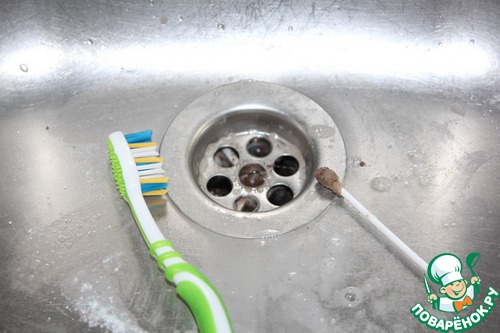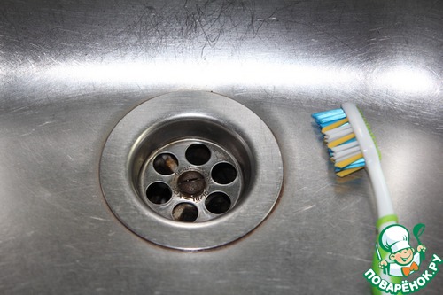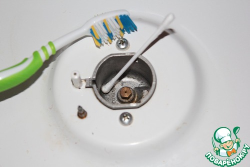 С моющим средством тщательно прочистим щёткой под соединением слива, а ватной палочкой отверстия в сливе.