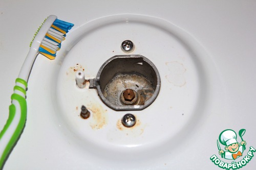 Теперь время крупной техники. Плита. Когда я мою плиту, то первым делом вооружаюсь зубной щёткой. Она отлично подлезает в различные стыки и щели.