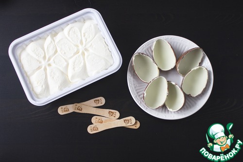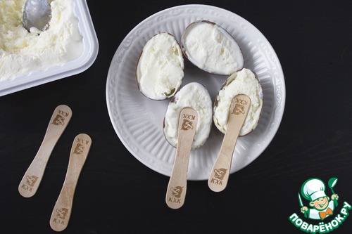 Мягким мороженым наполняем каждую половинку яйца. Вставляем деревянную палочку в одну из половинок, располагая ее по центру. Соединяем две половинки яйца вместе и убираем в морозилку на один час.