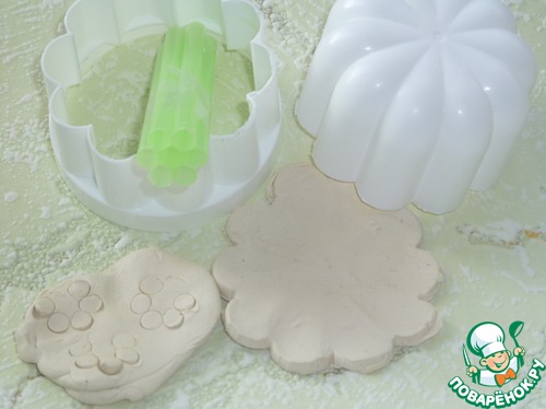 Вырезаем контур цветка формочкой и обратной стороной вдавливаем в мастику. В итоге получается цветок с контурами, лепестками, как на крышке. (на фото плохо видно, т. к все примеры я показывала на пластилине, а он менее пластичный. )