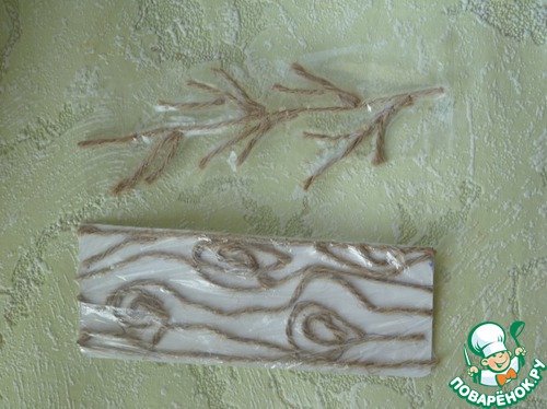 Фактура коры дерева и листа. На картоне нарисовать рисунок и приклеить по нем нитку, сверху закрыть пищевой пленкой. Для листа - скотч и нитки или можно приложить настоящий лист и не много вдавить в мастику