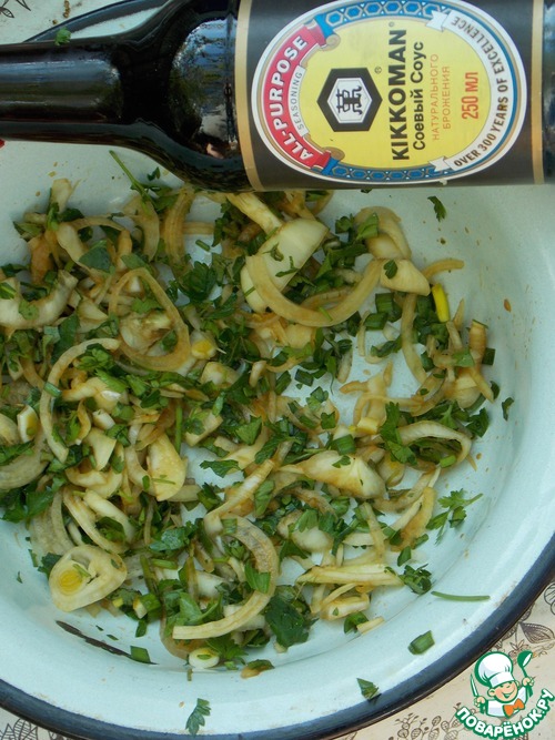 2 - Можно нарезать лук кольцами, добавить соевый соус ТМ "Kikkoman", свежерезанные травы, перемешать. Положить его к шашлыку, перемешать и оставить на 15 мин. Шашлык приобретет неповторимый аромат и вкус.