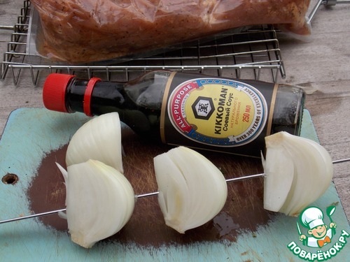 Затем когда нанизываете его между мясом то протыкаем шампуром начиная с внутренней стороны наружу. При жарке шашлыка обгорят носик и хвостик, а сама луковица получится очень вкусной.