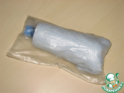 И так, готовим соляной раствор: на 0.5 литра воды - 3 столовых ложки соли. В пластиковые бутылки необходимого объема наливаем полученный раствор и кладем их в морозильную камеру на сутки. Бутылки с замороженным раствором советую завернуть в небольшое полотенце и поместить в пакет, чтобы конденсат, образующийся при таянии льда, не попал на продукты.