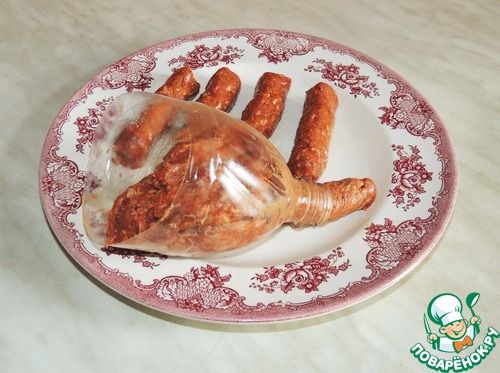 Фарш следует хорошо вымесить и отбить. Из пластиковой бутылки сделать приспособление, через которое продавливать фарш, формируя колбаски.