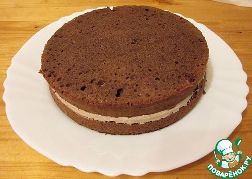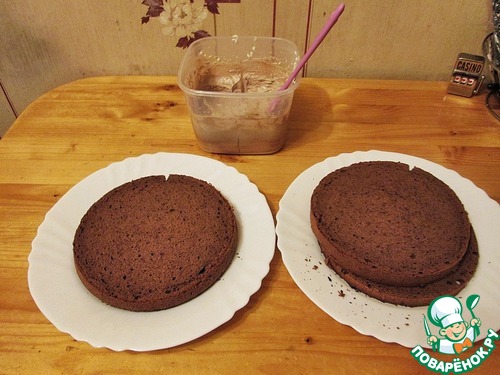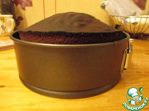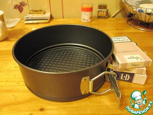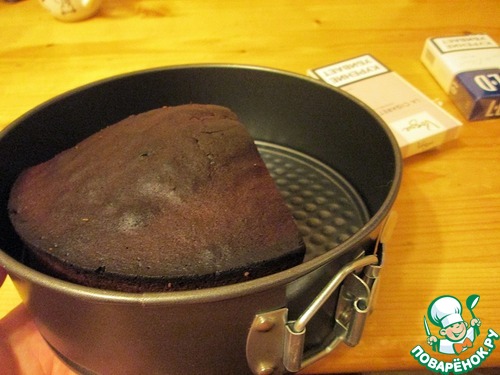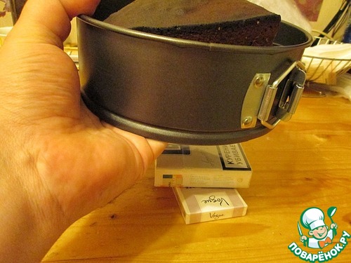 Разрезаем ведя прижатый к краям формы нож. Далее наращиваете упор и режете следующий корж
