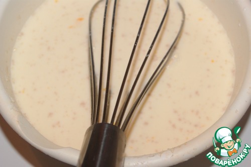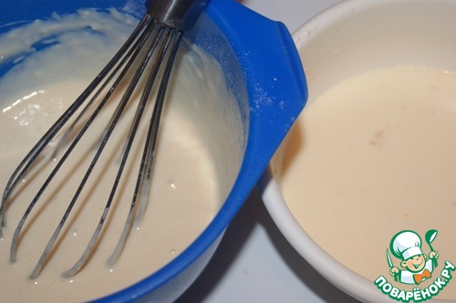 В муку влить половину жидкой смеси и тщательно взбить все венчиком.