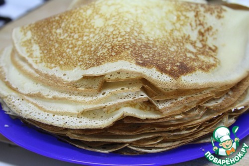 3. Если блины с начинкой предполагается дополнительно запекать в духовке, то выпекать их стоит с одной стороны и охладить на поверхности стола, противнях или тарелках. Затем начинить и дополнительно запечь в духовке.