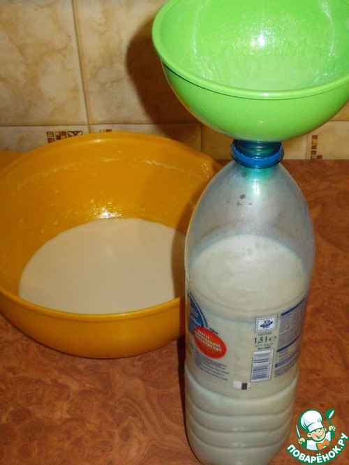 2. Размешиваем и переливаем в баклажку. Это количество ингредиентов на 1,5 литровую бутылку. Убрать в холодильник. Таким образом тесто можно хранить до трех дней.