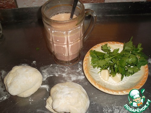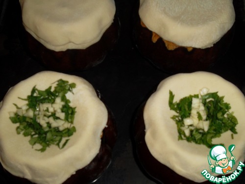 Горшочек с содержимым накрываем толстым кружком, немного прижимаем края, сверху насыпаем рубленную зелень и мелко резаный чеснок. Можно добавить сыр или масло, но не много. Если переборщить – начинка может «расплавить» тесто и во время приготовления упасть в горшочек – а это будет не красиво…