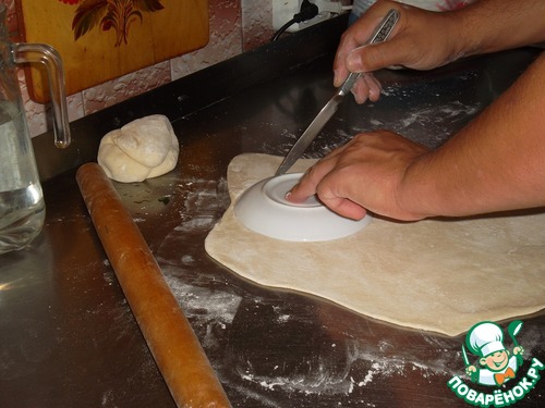 Раскатываем первую часть не много толще, а вторую – тоньше. Вырезаем ножом кружок «под блюдечко». Это как раз размер крышечки для стандартного горшочка…