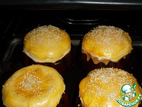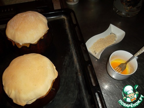Минут через 20…30 извлекаем горшочки, смазываем подбитым яйцом и посыпаем поджаренным кунжутом. Отправляем обратно в духовку – допекаться…