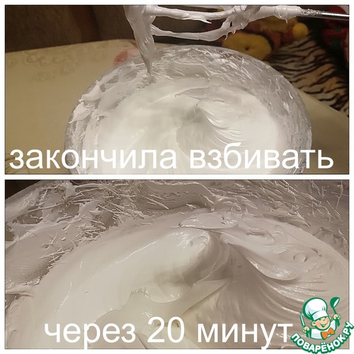 Медленная скорость не портит взбитые белки, проверено. А вот оставленные больше чем, на пару минут, белки начинают расслаиваться и пускать сироп, а вот это, точно портит меренгу. И еще раз повторяю, что я собирала советы по разным сайтам, и везде рекомендуют взбивать до полного остывания, именно это позволяет сахару не кристаллизоваться и ничего не испортить. А вот кристаллики образовавшиеся из за недостаточного взбивания будут хрустеть и это неприятно. Может длительное взбивание и ошибка многих, но только я реально пробовала разные методы и только этот, описанный мною алгоритм, позволил мне сделать настоящую устойчивую меренгу. Крем совершенно не тянулся, никаких проблем с ним не было. Я очень довольна результатом