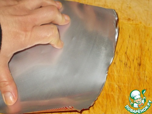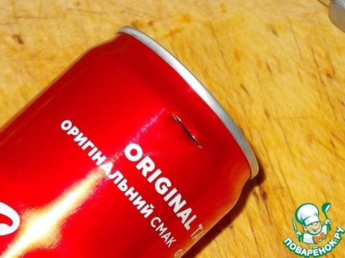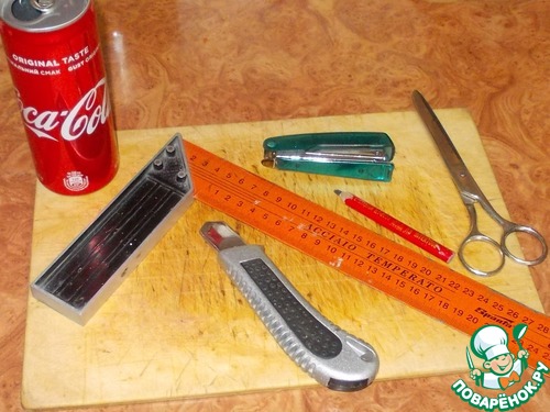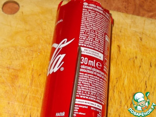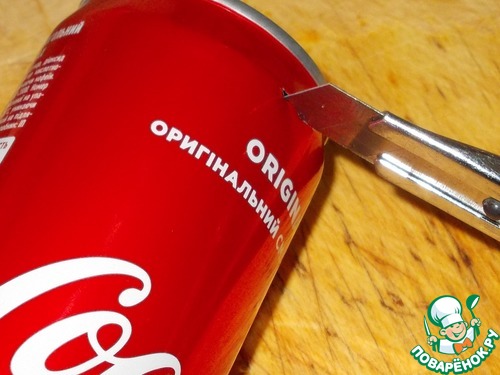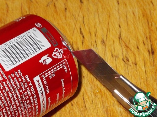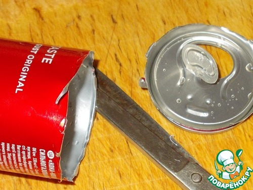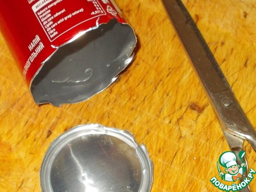 5. Теперь надо разрезать банку вдоль максимально ровно, чтоб образовался кусочек жести прямоугольной формы. За ровную линию можно взять либо стык банка, либо текст написанный ровным столбиком. Выбрав линию, разрезаем банку ножницами.