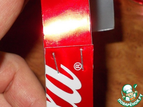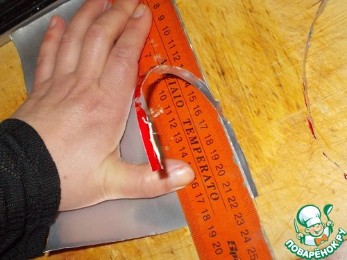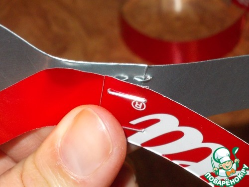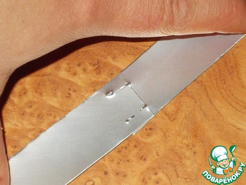 12. Вот нарезали наш кусочек жести на ровные полосочки. Из шести полосок можно сделать три вырубки. Итак, берем две полоски и с помощью степлера скрепляем их между собой.