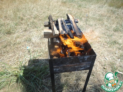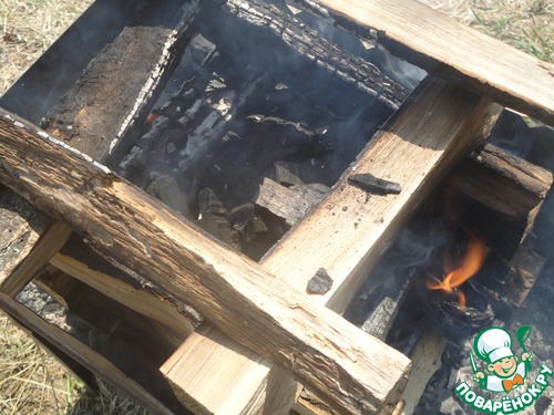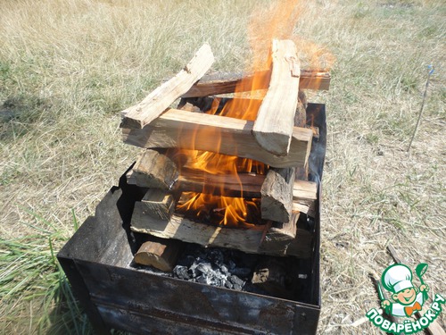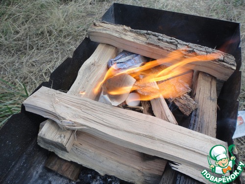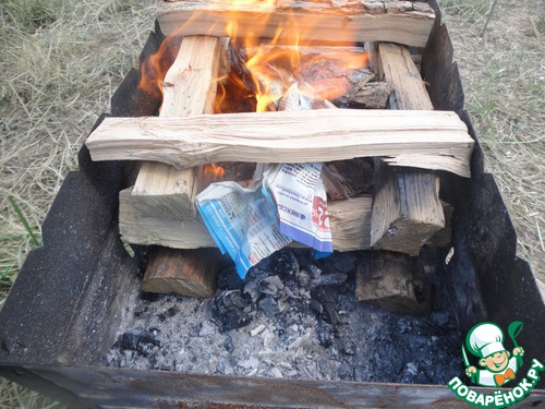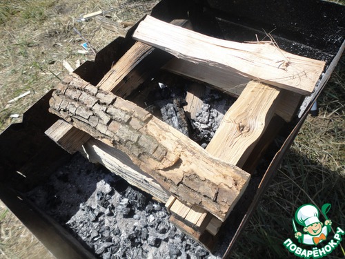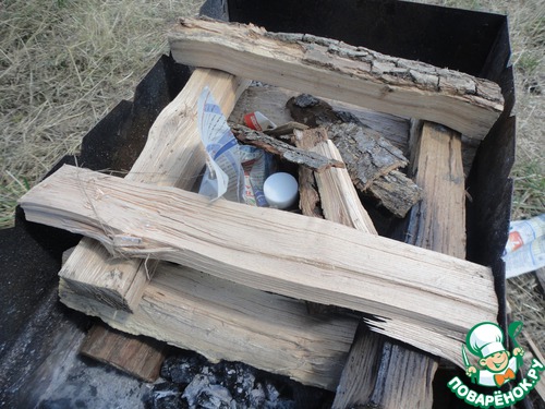 Выбираем две самые толстые дровиняки и кладем их на дно мангала. Далее "домиком" кладем еще четыре-шесть дровиняк потоньше.