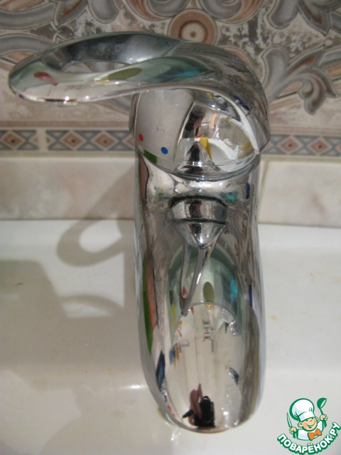 Смешать уксус с водой 1:1, добавить средство для мытья посуды, нанести на сантехническую арматуру, ванну, раковину и через 5 минут смыть водой.