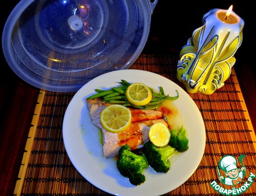 На тарелку кладем кусок рыбы и овощи как гарнир, поливаем соком выжитого лимона, соль перец по вкусу.