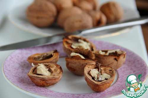 Вставляем кончик ножа между двумя половинками и слегка поворачиваем нож - половинки скорлупы легко разъединяются. Сам орех внутри остается сухим, что видно на фото. Из половинки скорлупы орехи легко достаются просто пальцами. А скорлупу я отдаю своей дочке, которая мастерит из нее замечательные поделки.