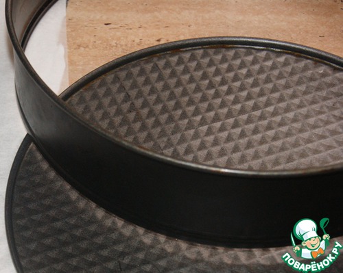 Если ваша форма поддекает – на лист фольги поместите лист пекарской бумаги, поместите их на донышко от разъёмной формы и надев сверху кольцо, застегните его. Поднимите края бумаги и фольги вверх.