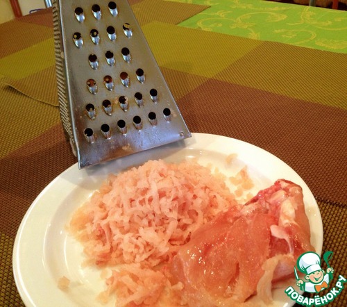 После этого натереть его на крупной терке. Трется легко, по ощущениям как картошка, мясо измельчается равномерно, не хуже, чем на мясорубке)