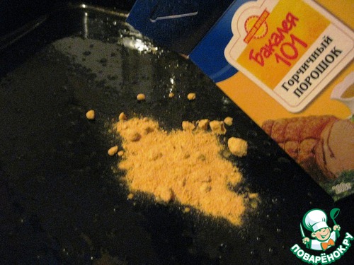 Я насыпала 1/2 ст. ложки горчичного порошка, смочить губку для мытья посуды водой и, собственно, приступать к работе.
