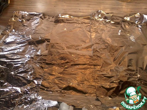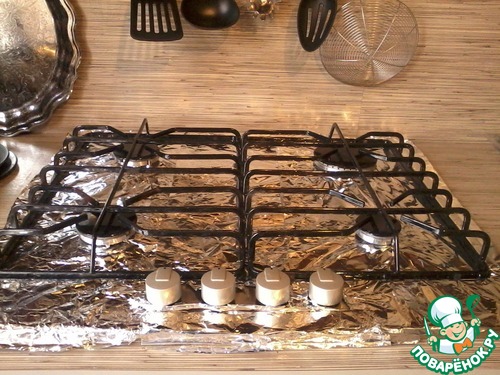 Так вот! Как грится "ближе к телу!" Чтобы избавить себя от этой канители я, как считаю, нашла идеальное решение! Все очень просто! У каждой уважающей себя хозяйки на кухне имеется фольга, вот она-то и будет нашей волшебной палочкой! Снимаем с плиты решетки и горелки, и... застилаем фольгой блестящей стороной вверх, у меня ушло по ширине три листа с нахлестом, в тех местах где электроподжиг фольга легко протыкается,
