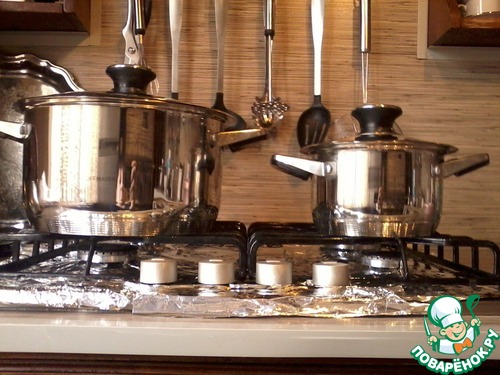 И обратите внимание, плита очень даже симпатично выглядит! И не выпадает из общего контекста кухни! Кроме того, мы получаем бонус, так как фольга отлично отражает тепло, горелки можно включать на меньшую мощность чем обычно! Друзья мои! А еще, я очень скоро расскажу вам о том как я приучила свои кастрюли к самостоятельности и они блестят у меня как новенькие, при этом это не стоит мне практически никаких усилий!