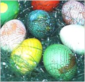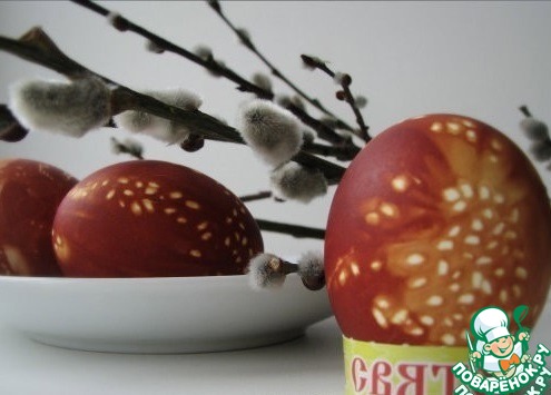 Чтобы яйца при окраске получились в крапинку, нужно мокрое яйцо облепить сухим рисом и замотать плотно чулком или марлей. Варить в любом красящем растворе.