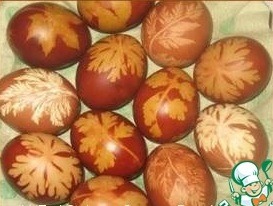 Я красила таким способом!Если в марлю,но не плотную, завернуть,тогда яйца получаются как чешуйка змеиная.А с листиком нужно не в марлю,а в чулок капроновый,тогда отпечатается только листик))
