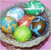 Восковая техника тоже достаточно проста и оригинальна. Единственное, что от вас требуется – повышенная осторожность, поскольку придется работать с огнем. Растопите воск, лучше это сделать на водяной бане. В емкость с расплавленным воском опустите сначала одну половинку яйца, затем другую. На мягком теплом воске по всей окружности яйца выдавите ниткой прожилки в произвольном количестве. Дайте воску затвердеть и опустите яйца в теплую воду с краской. Окрасятся лишь те места, которые свободны от воска, поэтому заранее продумайте, каким бы вы хотели видеть конечный результат. Если с высохших яиц воск плохо отстает, положите их в холодильник на некоторое время - воск легко снимется.