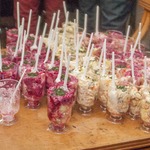 Большое количество человек собирается к вам в гости? Вот решение! Можно купить уже готовые салаты, разложить по одноразовым рюмочкам, вставить одноразовую ложку. Угощение готово. (на фотографии салат сёмга под шубой, оливье и селёдка под шубой) вы же можете положить туда всё что вашей душе угодно.