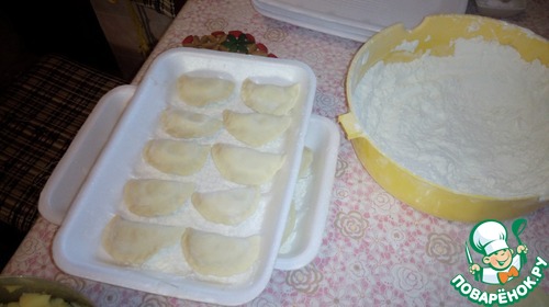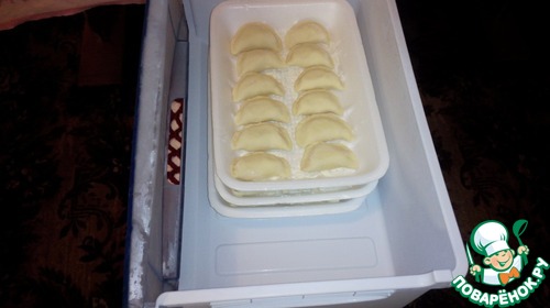 Лоточек нужно слегка притрусить мукой и свободно положить вареники.