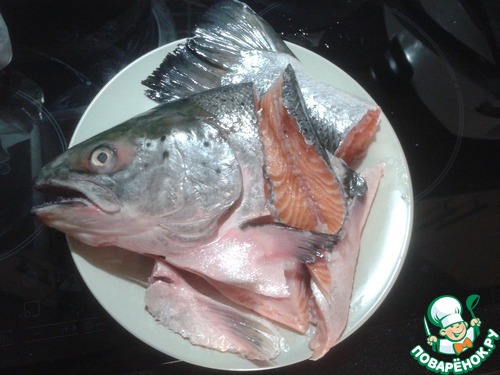 Далее отрезаем голову, хвост и плавники. Это пойдет на уху. Кладем в заморозку ли в кастрюлю))