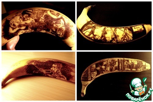Вместо кисточки используется зубочистка. Изображение процарапывается ей на кожуре банана. Чем сильнее надавливать, тем темнее будет линия. Через 5 минут можно рассмотреть, что получилось. Получаются рисунки, стилизованные под старые фотоснимки.