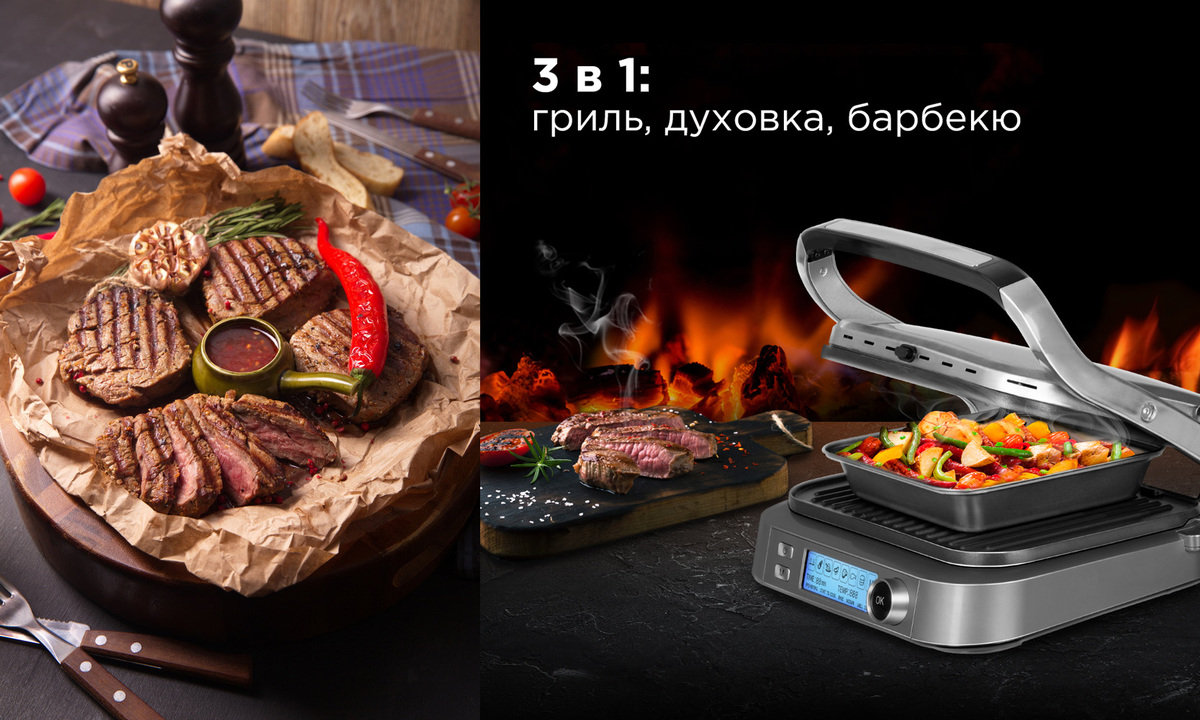 Правильно прожаренное мясо идеально в качестве основного горячего блюда. В гриль-духовке REDMOND RGM-M816P оно получится сочным, мягким внутри и с аппетитной корочкой снаружи. Надежное антипригарное покрытие не даст медальонам прилипнуть к панелям, а специальные индикаторы оповестят, когда стейк достигнет нужной степени прожарки: RARE, MEDIUM или WELL DONE. Хищный хранитель года будет доволен!
