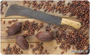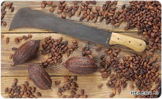 Каждый плод разрубают мачете и извлекают из него какао-бобы.